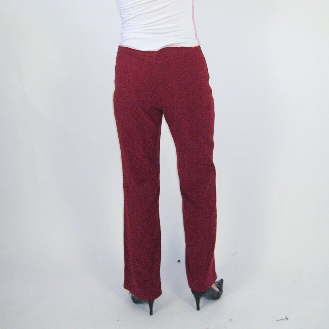 ♡ vintage high rise pant with statement red animal print and lace design. the printed portion is a denim like material and the solid red feels like soft velour. lightly stretchy fit with bootcut leg and zip fly.